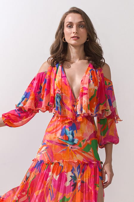Dark pink & multi colored chiffon gown with abstract prints & flared butterfly yoke, tiered bottom with back cut out and printed belt.