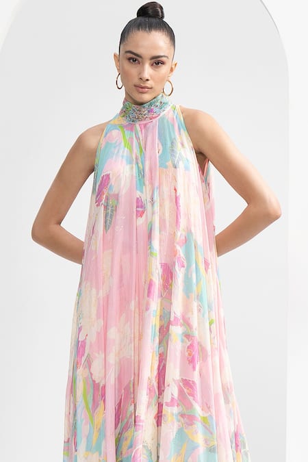 Pink chiffon maxi dress featuring an all-over tropical print and high neckline