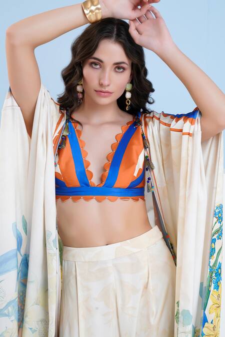 Ivory cape featuring vivid floral prints and tassel detailing. Paired with a scallop V neck bustier and flared pant.
