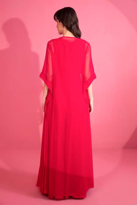Buy_Mani Bhatia_Red Georgette Jewel Stone Cape Open, Jumpsuit V Neck Cut-out With _Online_at_Aza_Fashions