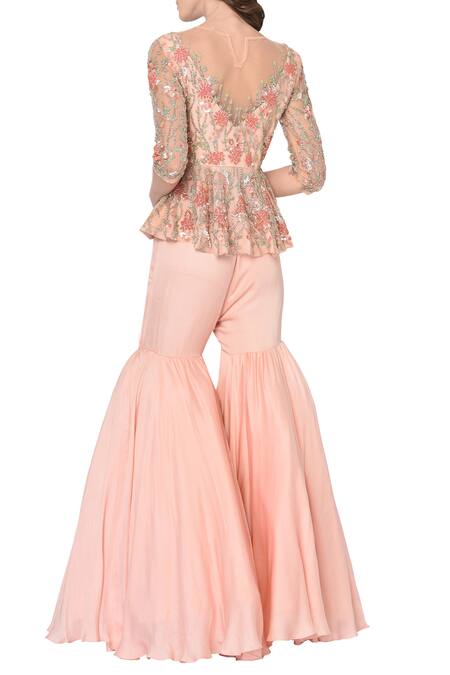 Ever so feminine, this sequin embroidered peach peplum top that comes with sharara pants and dupatta will leave you feeling oh-so-pretty.
