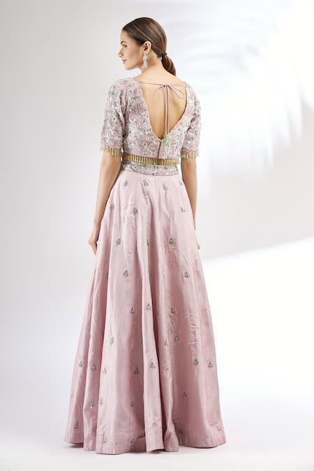 Hand embroidery >Sequin & cutdana embroidered floral motifs on blouse >Tassel detail on blouse hem >Deep back with tassel tie-up detail >Ruffle detail on dupatta borderClosure: >Blouse: Concealed back hook placket >Lehenga: Concealed side zip placket