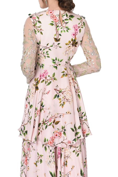 An outfit created to express allure to multi hued floral prints that lend to the fantasy of this soft pink anarkali kurta with a lehenga skirt and dupatta.