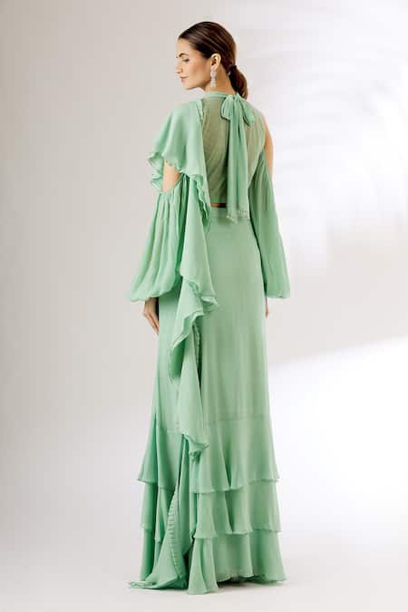 Mint green saree with ruffle detail on hem and pallu. Comes with blouse.