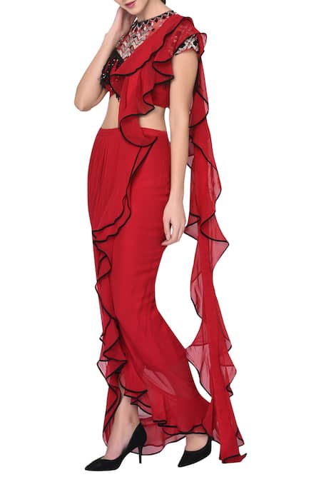 A juxtaposition of traditional sensibilities and mordern aesthetics, this pre-pleated ruffle saree comes with a sequin embroidered blouse.