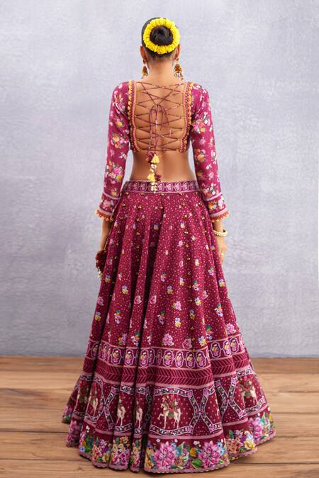 Ruby red lehenga with all-over multi-color floral print & embellishments. Comes with plunging neckline blouse & dupatta.