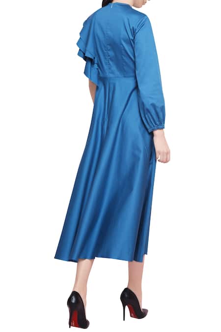 Buy_Manika Nanda_Blue Cotton Satin Round Ruffle Midi Dress _Online_at_Aza_Fashions