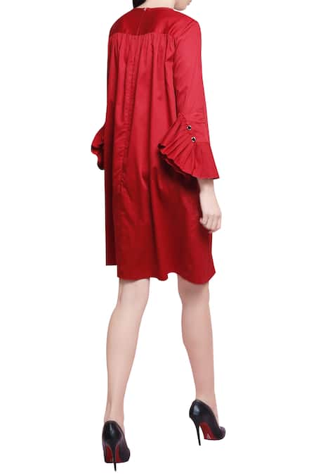 Red short dress with pleated sleeve hems & trapeze silhouette.