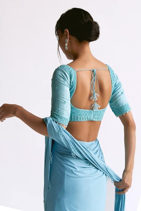 Sky blue pre-draped saree featuring scallop beaded tassel embellishments on the border. Paired with a half sleeves square neck blouse adorned with all over sequin, bead, and cutdana embroidery.