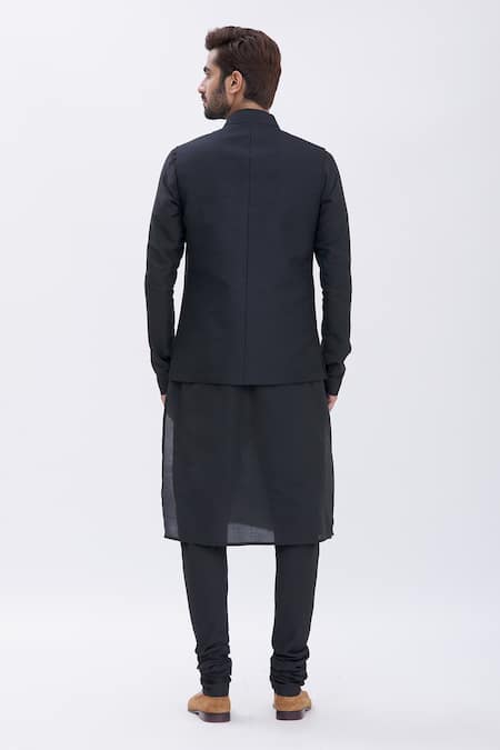 Black bundi with multicolor thread embroidery, patch & welt pockets. Paired with kurta & churidar.