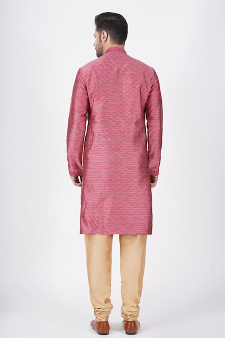 Pink kurta featuring floral jacquard woven motifs and dori embellishment on the collar. Paired with a churidar pyjama with an elasticated waistband.