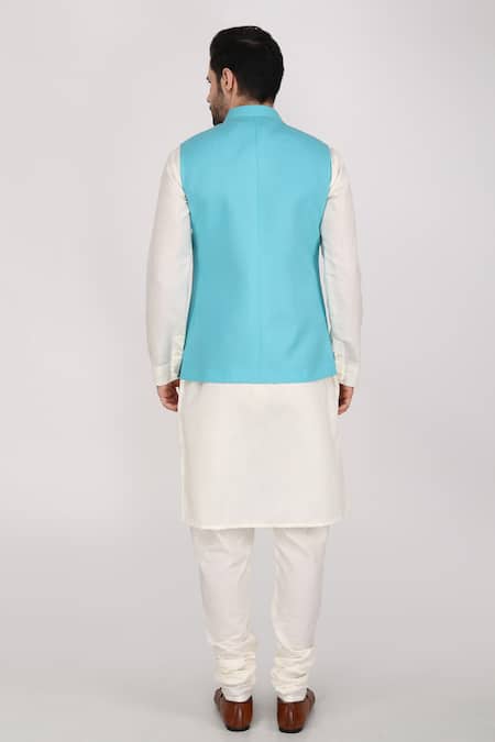 Turquoise bundi with geometric pattern quilting. Paired with ivory kurta & churidar pyjama.