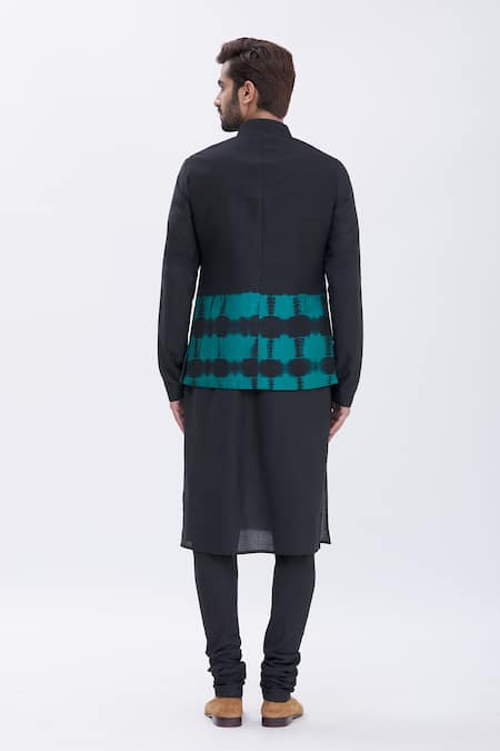 Black bundi with tie dye panel, patch & welt pockets. Paired with kurta & churidar.