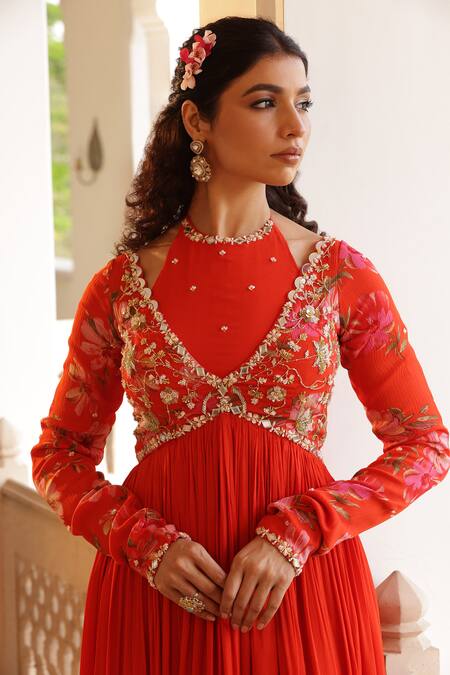 Orange anarkali featuring floral and mirror work with zardozi embroidery. Paired with a coordinating floral printed dupatta.