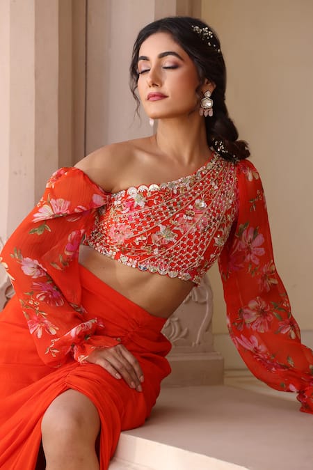 Orange blouse featuring asymmetric neckline, floral printed bishop sleeves, and hand embroidered sequin and mirror work. Paired with a ruched drape skirt with a side slit.