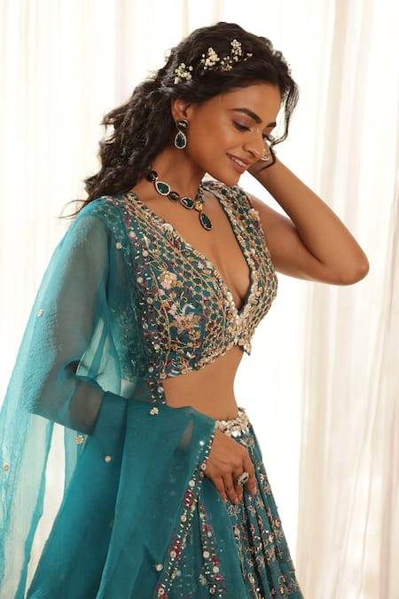 Green lehenga featuring hand embroidered floral designs with mirror work and sequins. Paired with a matching embroidered blouse and organza dupatta with decorative borders.