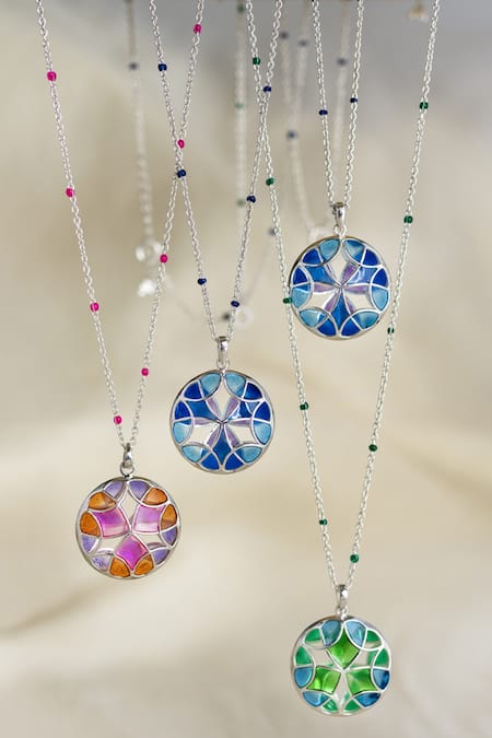 Silver pendant necklace featuring blue, aqua, and purple enamel detailing. Chain length measures 24.3 inches with a pendant length of 1.16 inches.