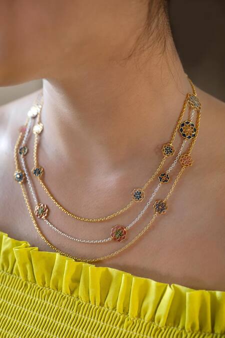 Gold plated tri-layered necklace featuring enamelled gul motif embellishments. Length measures 18 inches and includes an S lock closure.