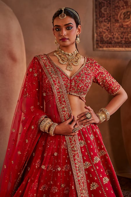 Red raw silk lehenga featuring floral vine hand embroidery with sequins and cutdana. Paired with a silk padded blouse and net dupatta with embroidered borders.