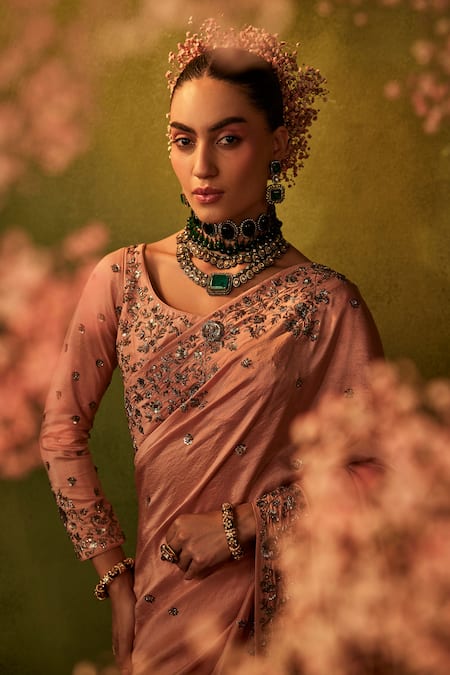 Pink organza saree featuring sequin, cutdana, and zardozi embroidery. Paired with a padded blouse with full sleeves and a matching petticoat.