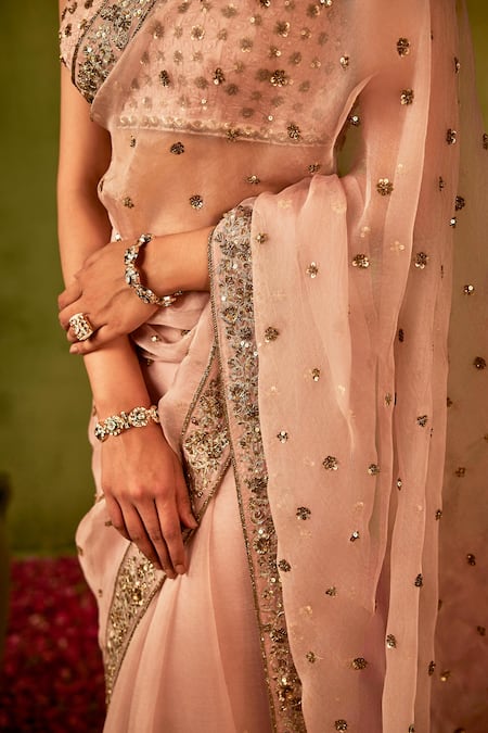 Pink saree featuring circular sequin, zardozi, and aari hand embroidery. Paired with a silk blouse embellished with circular sequin embroidery and includes a satin petticoat.