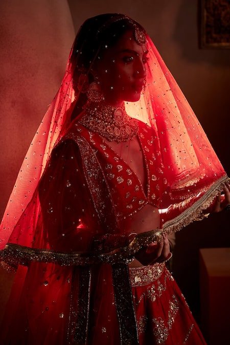 Red Silk, Net Cut Work, Sequins, Embroidery Plunge Neck Bridal Lehenga Set