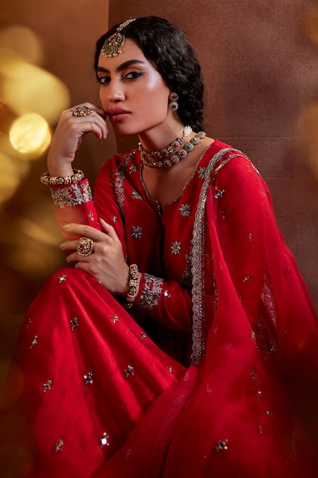 Red silk anarkali featuring hand embroidery with zardozi, aari, cutdana, mirror, and sequins. Paired with a silk pant with embroidered border and an organza dupatta with scallop lace borders.