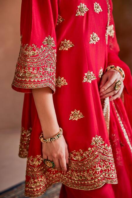 Red silk kurta featuring hand embroidery with zardozi, aari, sequins & cutdana in floral patterns. Paired with embroidered silk pant and organza dupatta with fringed borders.