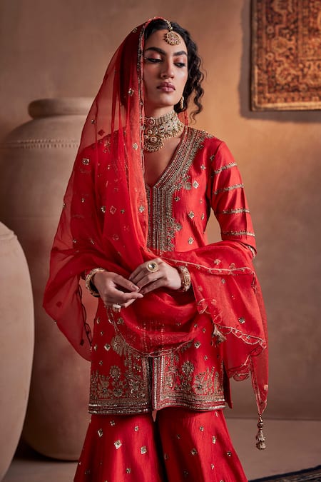 Scarlet silk kurta featuring cutdana and sequin hand embroidery on the front, back, and sleeves. Paired with a matching silk gharara and an organza embroidered dupatta with tassels.
