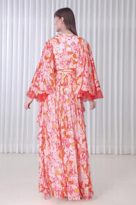 Orange Organza, Chiffon, Brocade V-neck Multi Color Flared Sleeve Printed Dress