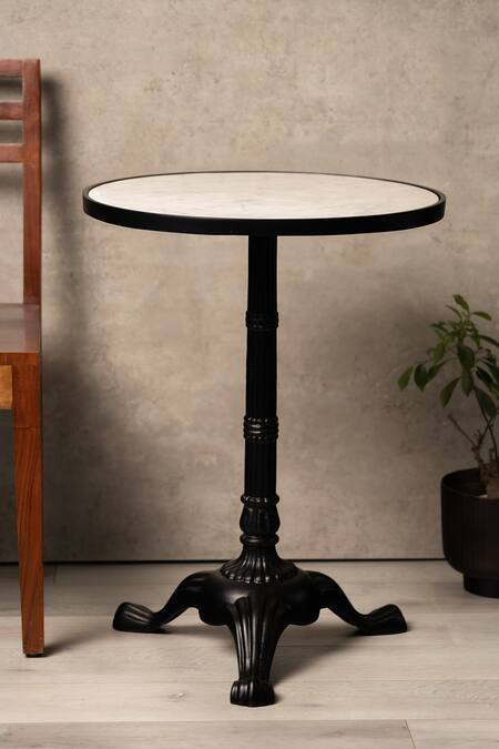 White circular-shaped table with a marble top and black metal carved stand.