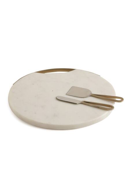 White circular-shape chopping board with a gold rim. Comes with one knife and one spatula.