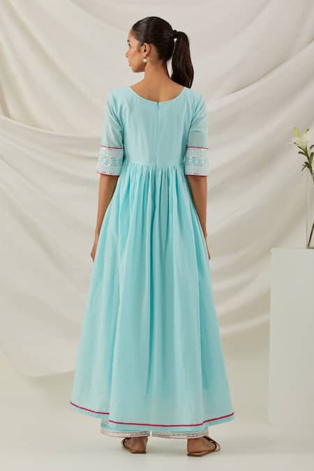 Blue Cotton Embroidery, Lace V-neck Markab Anarkali Palazzo Set