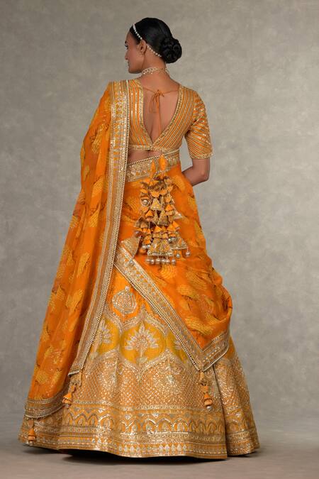 Orange lehenga featuring intricate gold dori, sitara, and moti work with a plunge V neck blouse. Paired with a digital printed organza dupatta and a separate cancan skirt.