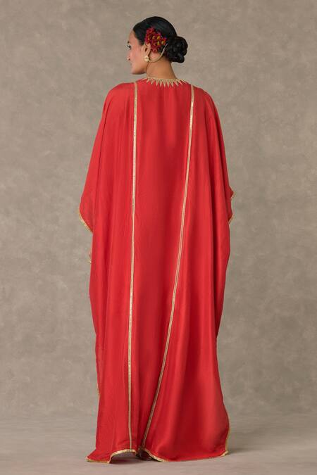 Red kaftan featuring candy swirl patchwork with dori and sitara work. Comes with a matching slip for added comfort.