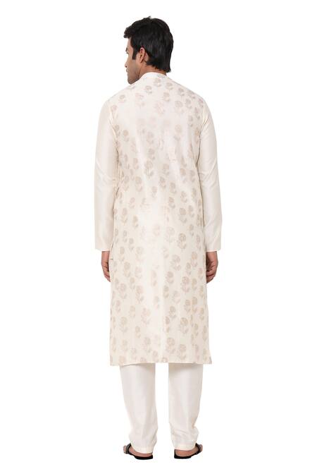 Ivory jacket-style straight long chanderi kurta with placement pillar motif foil print, overlay detail & side slits.