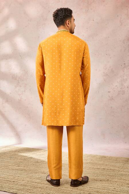 Yellow designer kurta made of mulsilk featuring a unique print and intricate detailing