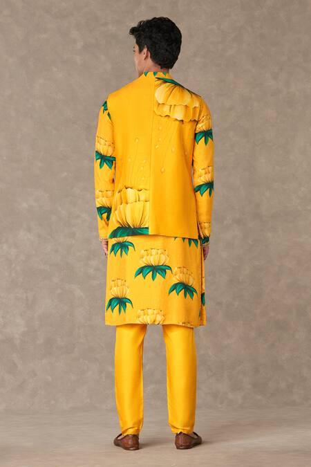 Mustard bundi featuring placement masakali floral prints and a mandarin collar
