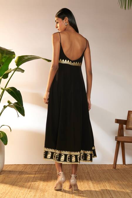 Black Crepe, Silk Foil Printing Scoop Neck Border Backless Dress