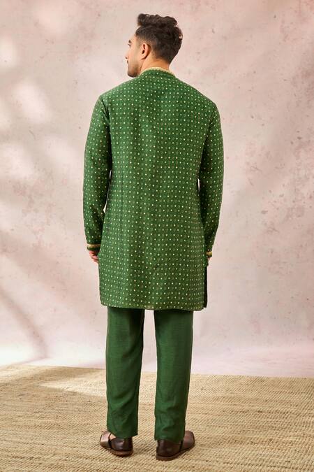 Green kurta made from mulsilk featuring intricate patterns and a front placket