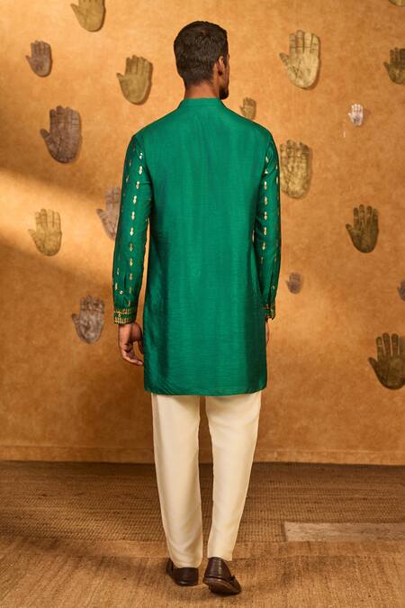 A green raw silk kurta featuring an all-over foil printed totem line pattern, full sleeves, a mandarin collar, pocket detail, and a concealed placket. It is paired with off-white raw silk straight pants with pockets.