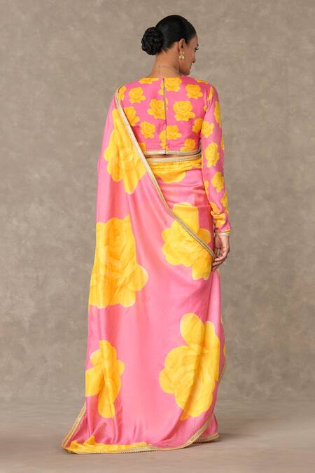 Pink raw silk saree featuring all-over contrast 'Gulaab' print and metallic gota & sequin embroidered border. Includes an unstitched blouse piece for customization.