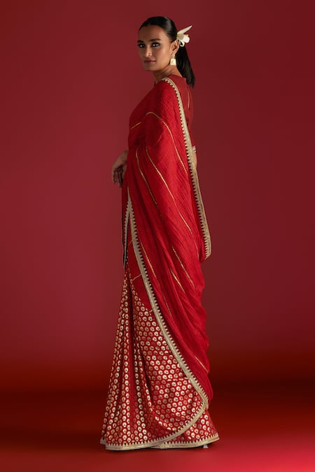 Red Silk Gota Patti, Foil Honeycomb Crushed Palla Saree With Blouse Piece