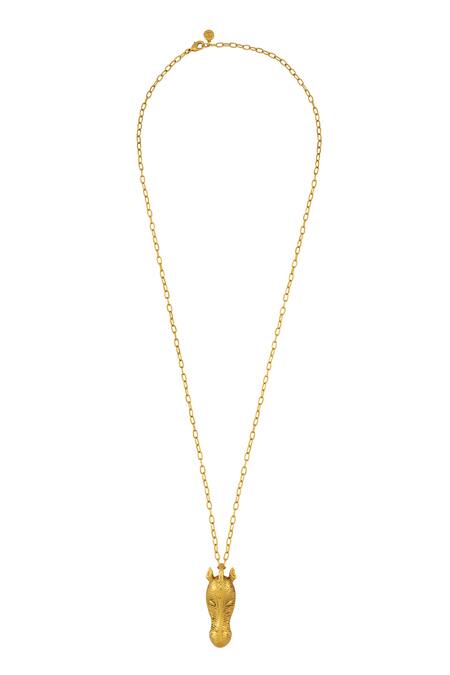 Gold plated chain necklace with carved horse mask pendant motifs.