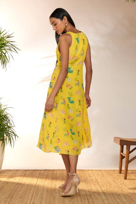 Yellow Crepe, Silk Beads V-neck Jam And Toast Print Midi Dress