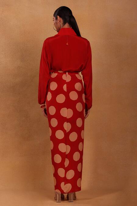 Maroon draped skirt with polka dot motif prints & asymmetric hem. Paired with oversized shirt with placement bird motif print.
