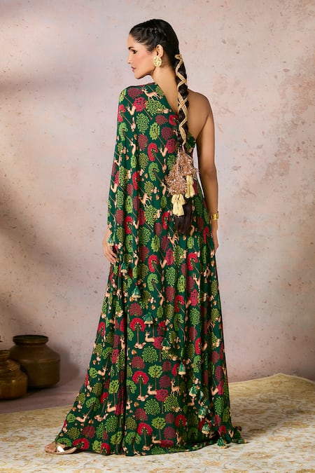 Green Crepe, Silk Tassels One Shoulder Midnight Maze Dress