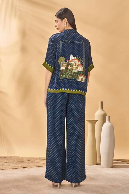 Navy Crepe, Silk Embroidery Collared Midnight Holiday Home Shirt