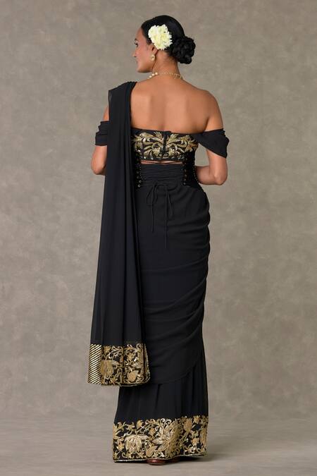 Black pre-stitched saree featuring pleated draped details and an attached pallu. Paired with an embroidered padded blouse with cowl sleeves and a velvet corset.