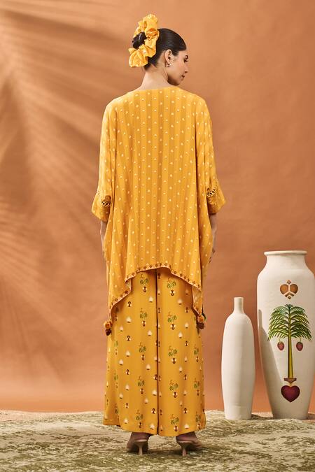 Buy_Masaba_Yellow Crepe, Silk Embroidery V-neck Ochre Spade Blossom Kurta Set_at_Aza_Fashions